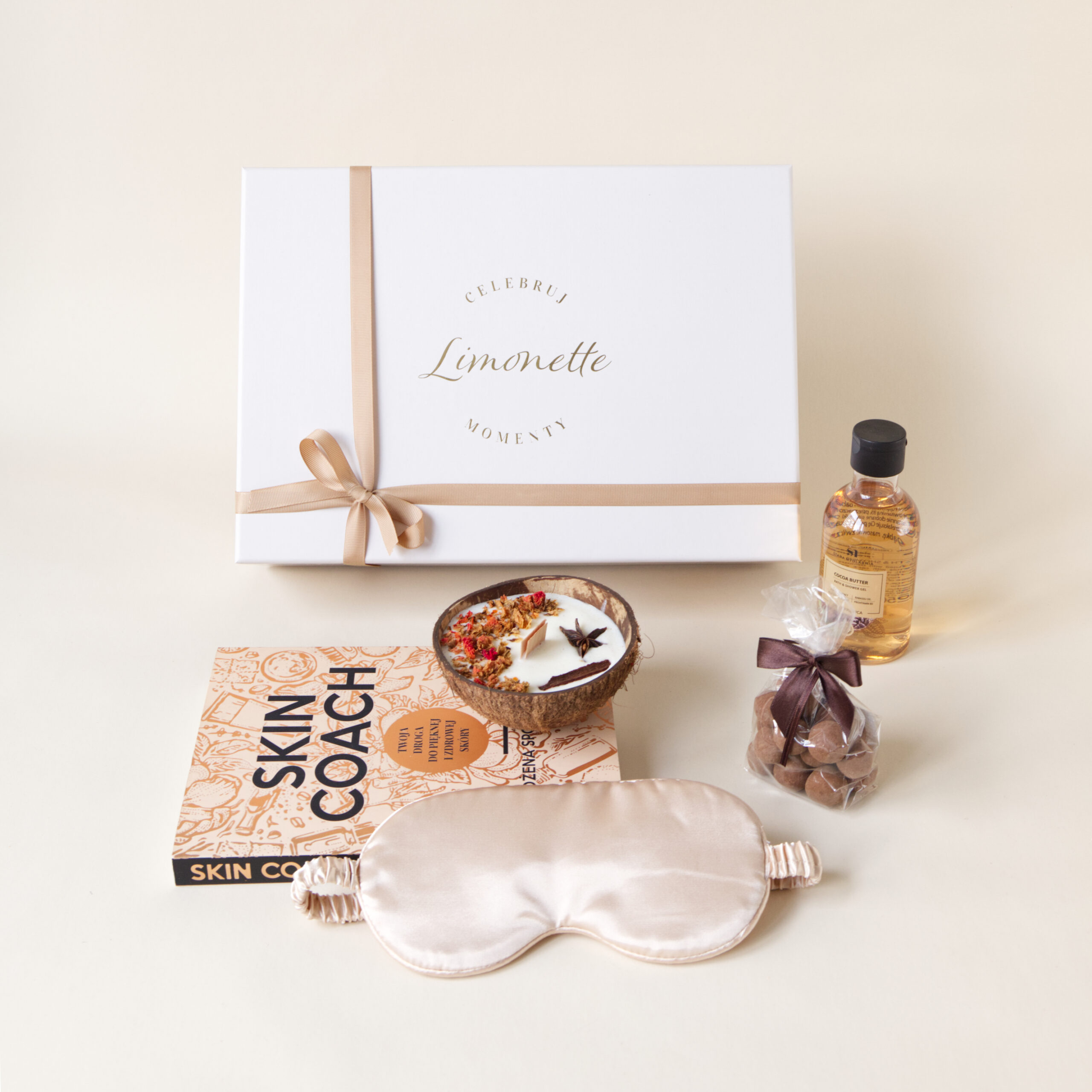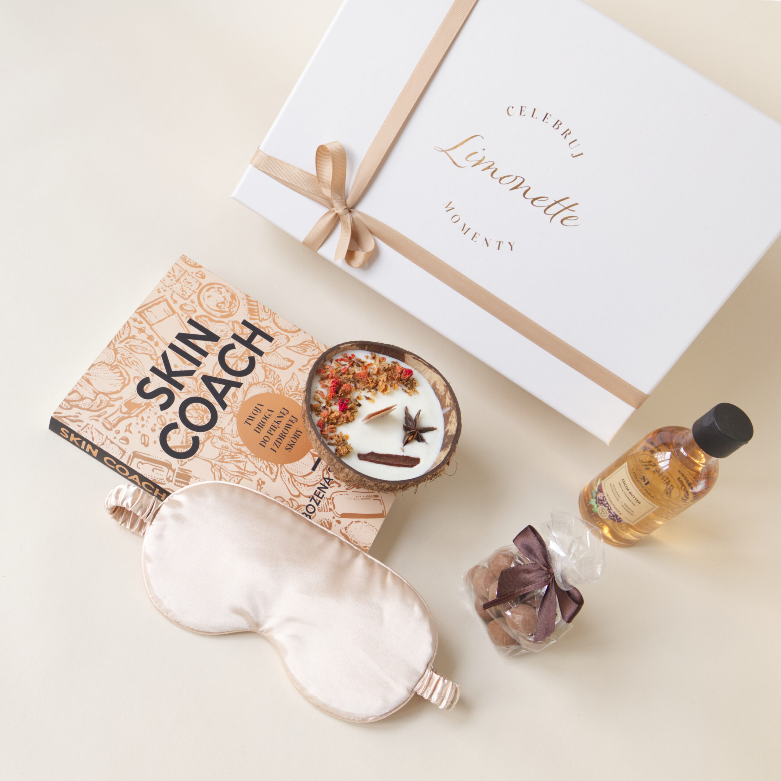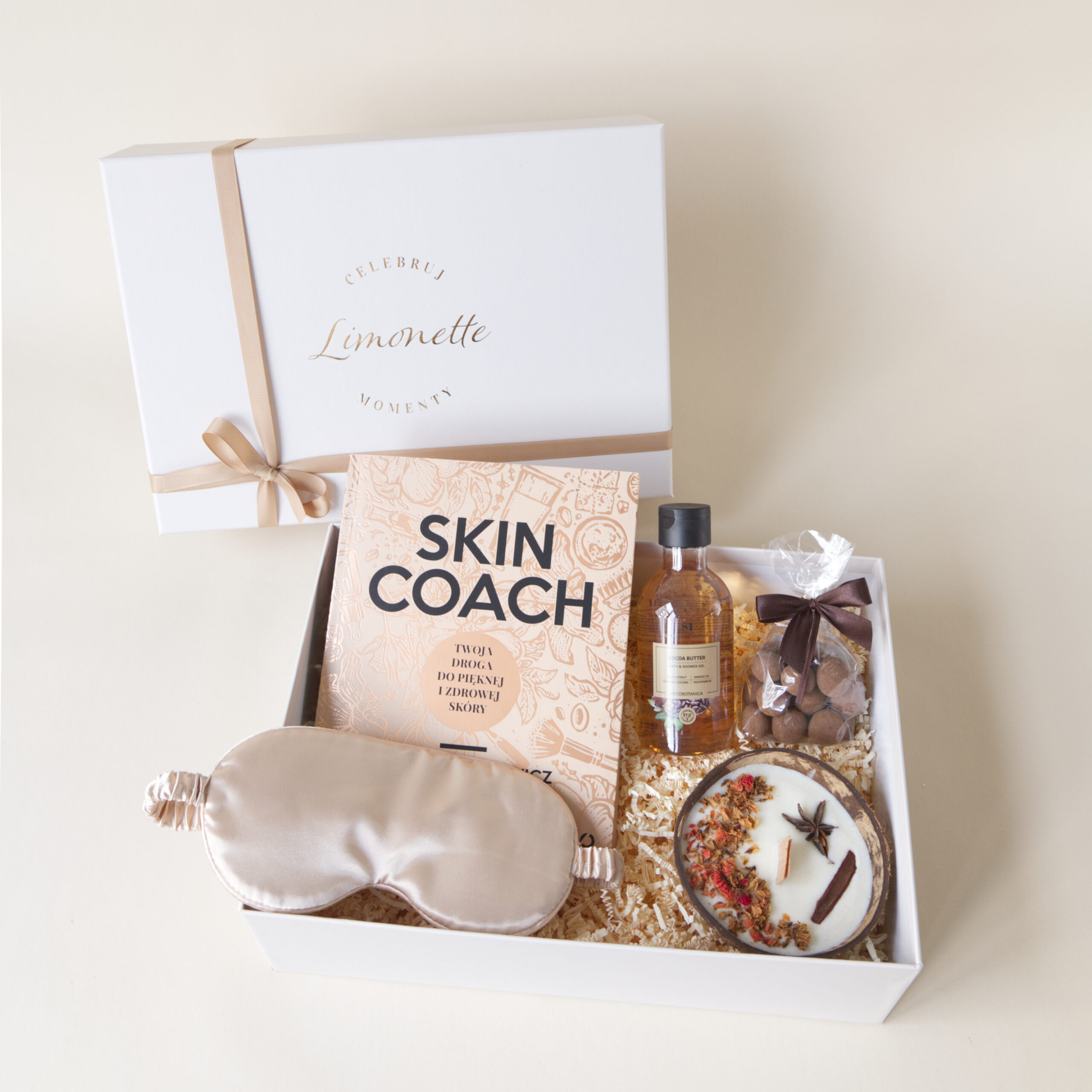 Rozpocznij swoją pielęgnacyjną podróż z książką „Skin Coach”, która odkryje przed Tobą tajniki zdrowej i promiennej skóry. Następnie załóż gładką beżową opaskę na oczy, która pozwoli Ci odciąć się od świata i w pełni zrelaksować się.